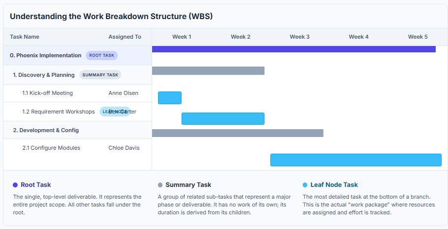 • Root Task: The top-level summary task that shares the name of the project. All other tasks are nested beneath it, and its duration and cost are a roll-up of all child tasks.