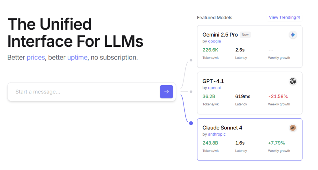 - Unprecedented Flexibility: With OpenRouter, your applications can dynamically switch between models based on the specific task at hand. You can use a fast, inexpensive model for simple tasks and seamlessly switch to a more powerful model for complex requests, all within the same application.