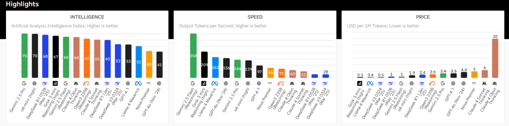 Artificial Analysis provides a clear, high-level view of the model ecosystem, breaking down the options by key business metrics: