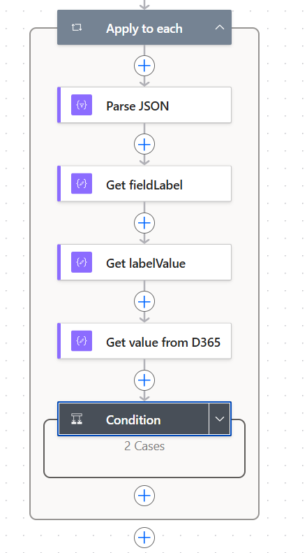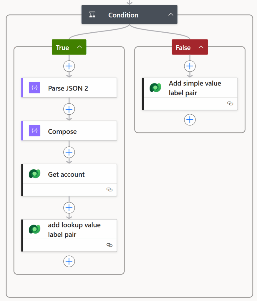 The last condition is not mandatory but something i introduced since I had a lookup to account and wanted the accountname instead of the ID in value, so it checks if the action «Get value from D365» contains ‘/accounts’ and if yes follows the yes branch, I’ll include this branch also – but as stated it’s not mandatory to use.